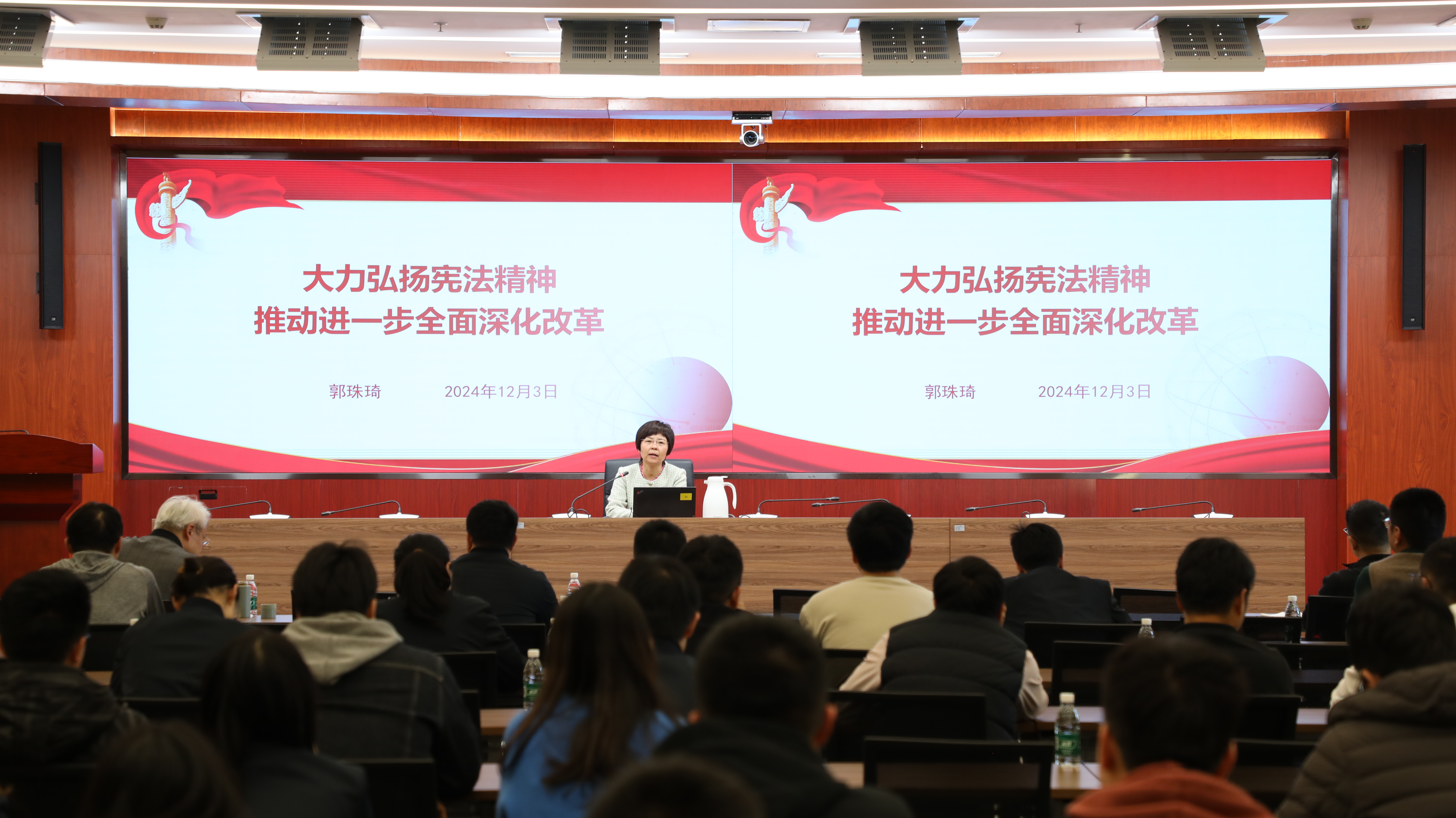為進一步學習宣傳習近平法治思想,弘揚憲法精神、維護憲法權威,12月3日,航天智能院以“大力弘揚憲法精神,推動進一步全面深化改革”為主題,開展2024年“憲法宣傳周”活動。航天智能院總會計師、首席合規官郭珠琦,院本部各部門、院屬各中心近80余名干部職工參加本次活動。