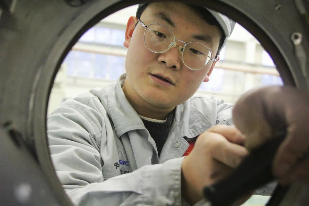 裝配車間內(nèi),負(fù)責(zé)首件產(chǎn)品艙段裝配工作的操作員楊振宇,正手持塞尺,對(duì)一部件的安裝間隙進(jìn)行裝后自檢。